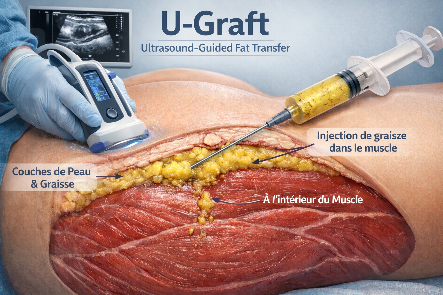 Vous rêvez d’un ventre plus sculpté, d’abdominaux plus visibles ou de muscles plus volumineux sans passer par des implants ou des heures interminables à la salle de sport ? L’U-Graft (Ultrasound-Guided Fat Transfer) est une technique récente et innovante qui répond exactement à ce besoin. Contrairement au lipofilling classique qui injecte la graisse sous la peau, l’U-Graft va directement à l’intérieur du muscle pour l’étoffer de façon naturelle.
